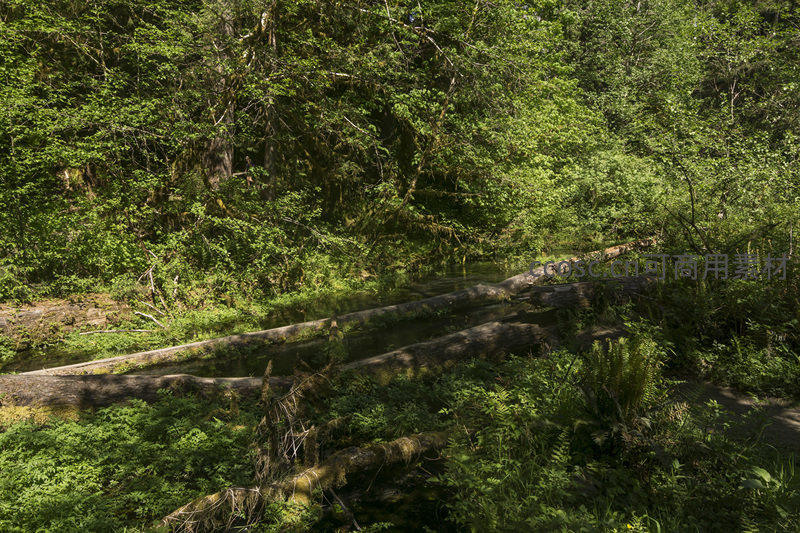 几根粗壮的倒木横跨在清澈的小溪上,周围是湿漉漉的苔藓和蕨类植物,展现了森林生态系统中水与植被的和谐共生。