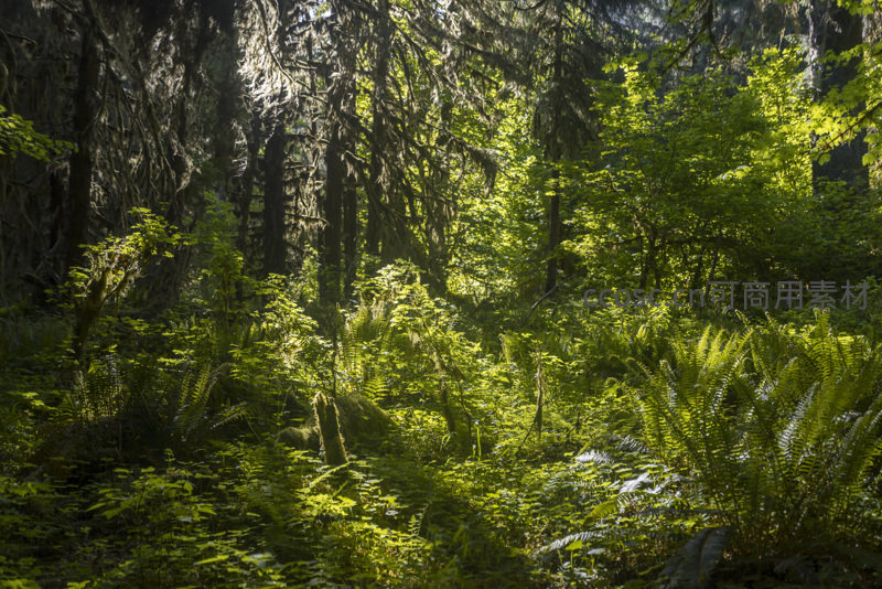 晨光穿过高耸的树冠,洒在覆盖着青苔与蕨类的林间地面上,营造出一片静谧而生机勃勃的绿色世界。