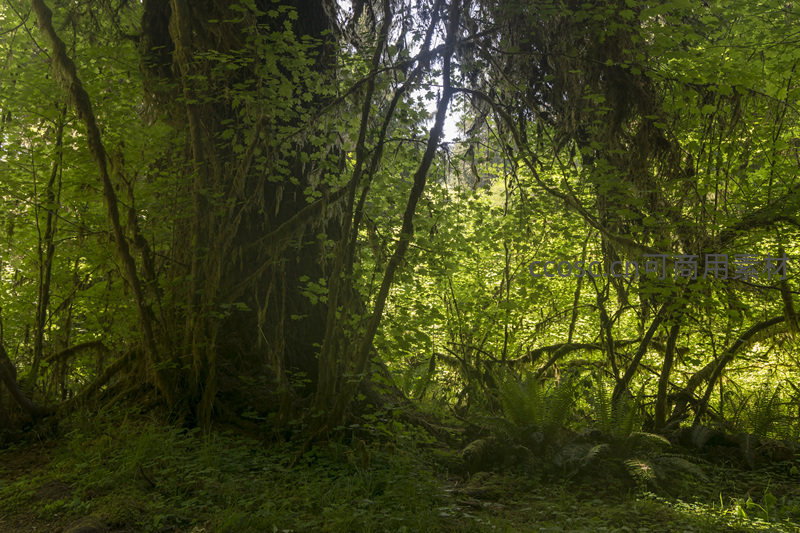 粗壮的树干缠绕着垂挂的苔藓,斑驳的阳光透过枝叶,在湿润的林地上投下柔和的光影,充满原始森林的气息。