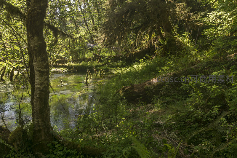 清澈的小溪静静流淌,水面如镜般倒映着四周葱郁的树木和灌木,构成一幅和谐宁静的森林水景图。