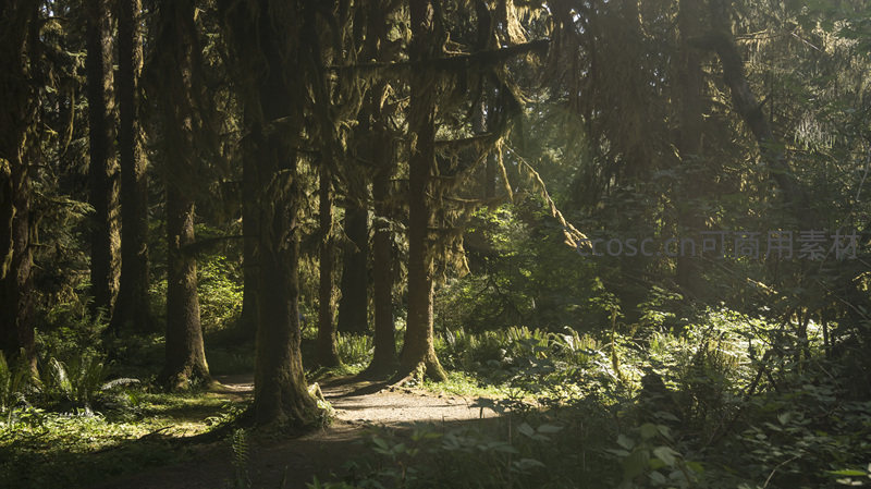 一条蜿蜒的土路穿行于参天大树之间,阳光从树梢缝隙倾泻而下,照亮了脚下的路径与周围的绿植。