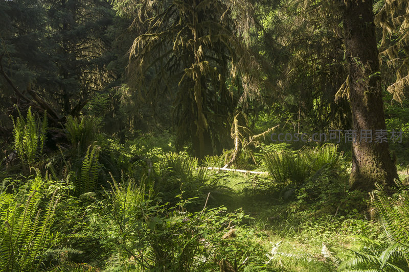 茂密的原始森林中,高大的树木被厚厚的苔藓包裹,阳光透过枝叶洒在地面,翠绿的蕨类植物生机勃勃,营造出宁静而神秘的自然氛围。
