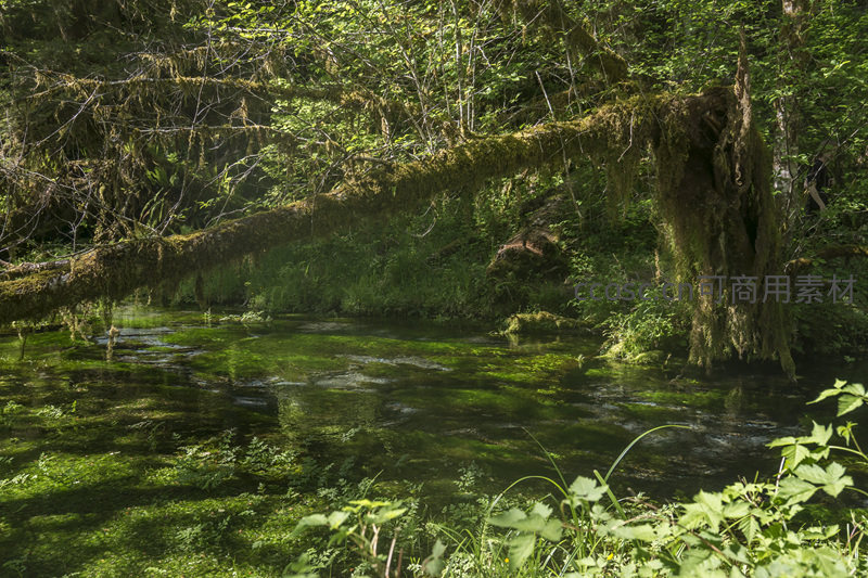 跨越溪流的古老树干,如天然拱桥般连接两岸绿意