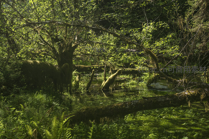 阳光穿过枝叶,在布满苔藓的倒木和湿地水面上投下斑驳光影,展现了一幅充满层次感与生命力的森林湿地画卷。