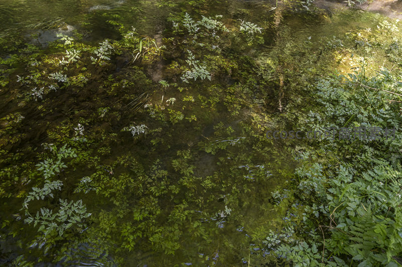 从上方俯瞰,清澈的溪水中水草清晰可见,形态各异,随水流轻轻摆动,展现了水下世界的细腻与生命力,充满自然野趣。