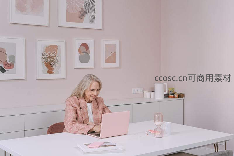 一位银发女士身穿格纹外套,在装饰有艺术画作的粉色书房中,使用粉色笔记本电脑,桌上有沙漏和咖啡杯。