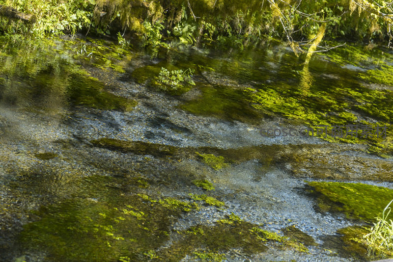 阳光透过树影洒在清澈见底的溪流上,水底铺满细小石子,翠绿苔藓附着其上,营造出宁静而生机盎然的自然画面。