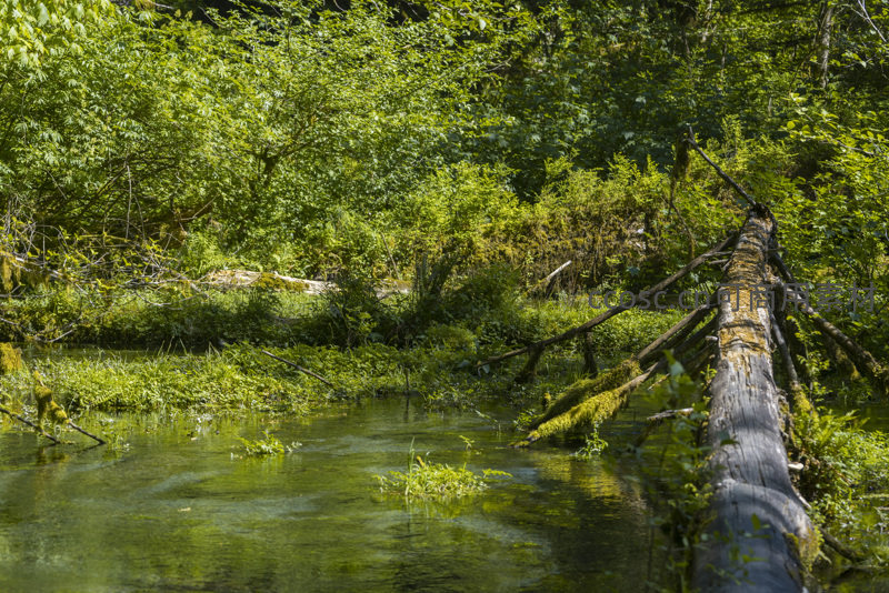 阳光透过茂密树冠洒在清澈溪流上,倒伏的枯木被青苔温柔包裹,水底绿植摇曳,营造出原始而静谧的自然秘境。