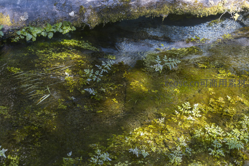 俯视视角下,溪水清澈见底,水草随波轻舞,岸边苔藓蔓延至石缝,阳光照射下色彩层次丰富,呈现微观自然生态的细腻之美。