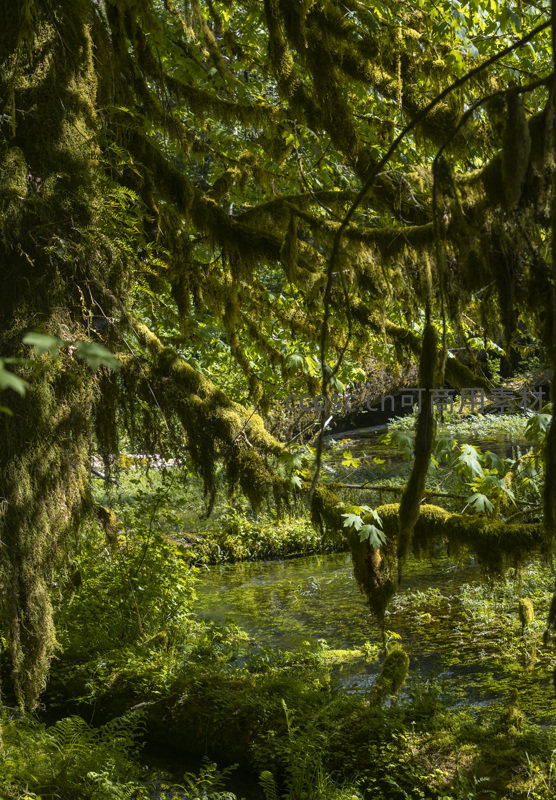 浓密的苔藓从高处树枝垂落,如天然帘幕般笼罩着下方潺潺溪流,光影交错中展现原始森林的神秘与丰饶生态。