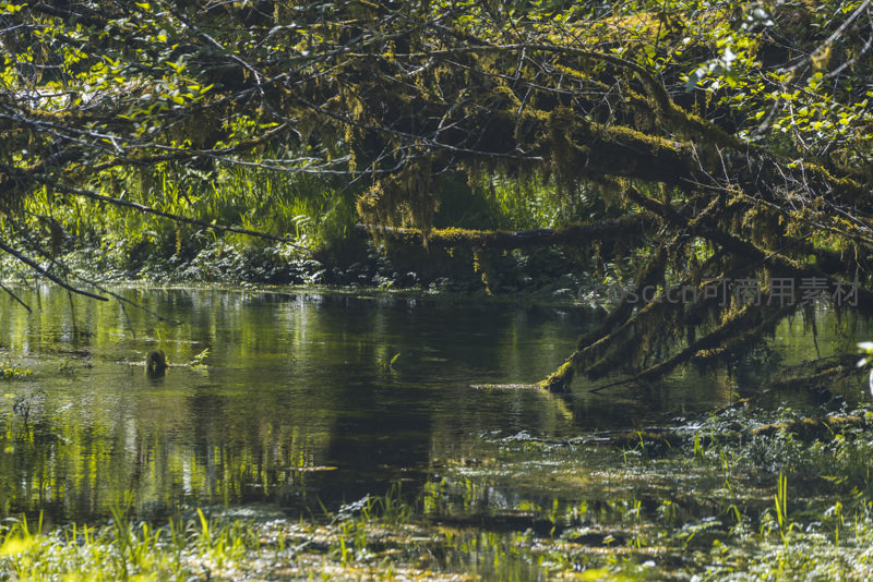 阳光透过茂密树冠洒在布满青苔的枝干与清澈水面,倒影交织,营造出幽静神秘的原始森林氛围。