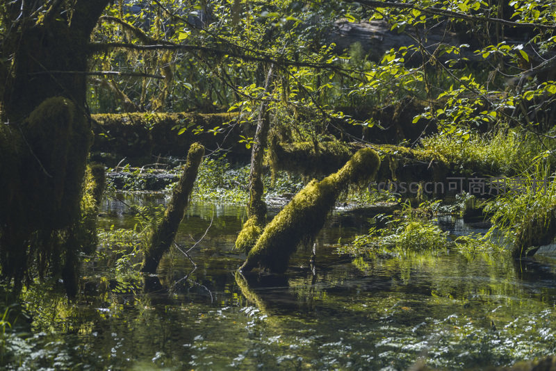 清澈的水面映照着被浓密青苔包裹的枯木,光影交错,构成一幅充满生命力与宁静感的湿地生态画卷。