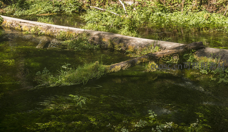 横卧溪中的朽木与水草共生景象