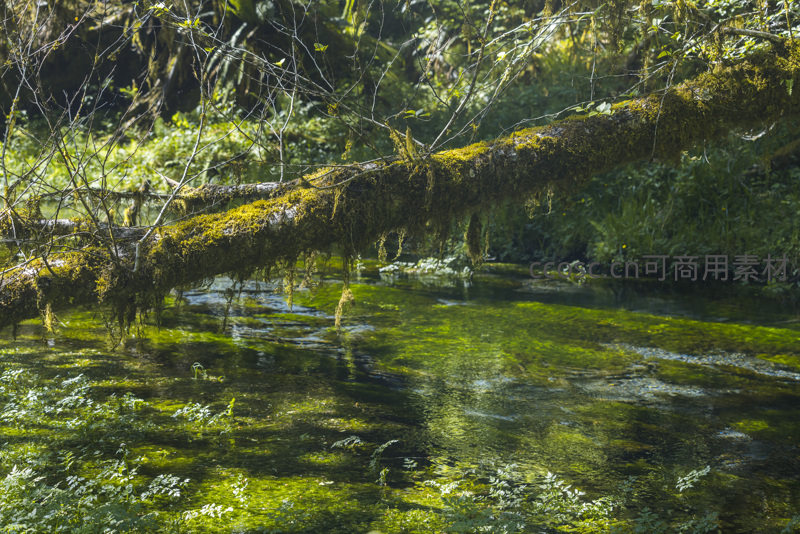 阳光透过林间洒在覆盖着浓密苔藓的倒木上,清澈见底的溪水缓缓流淌,水中绿藻与倒影交织,营造出一片静谧而生机勃勃的原始森林景象。