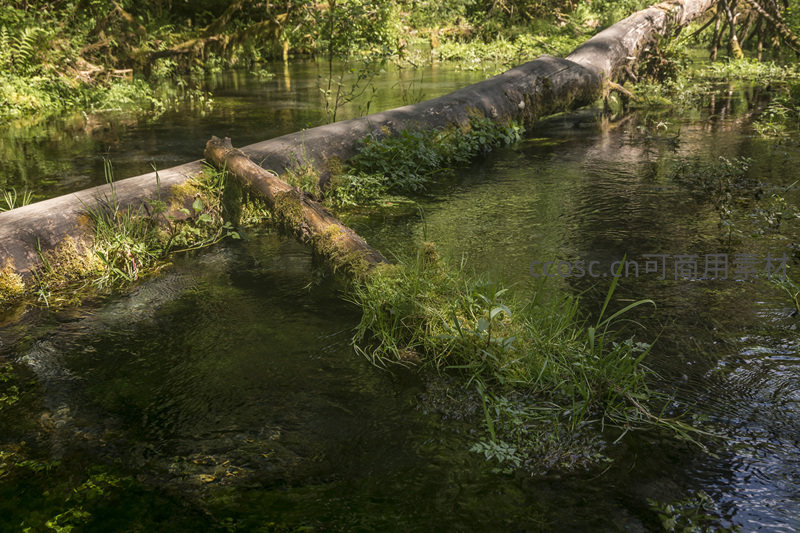 一根巨大的倒木横卧于清澈溪流之中,其表面与缝隙间生长着茂盛的水生植物和青苔,水流轻柔环绕,展现了森林湿地中生命相互依存的和谐画面。