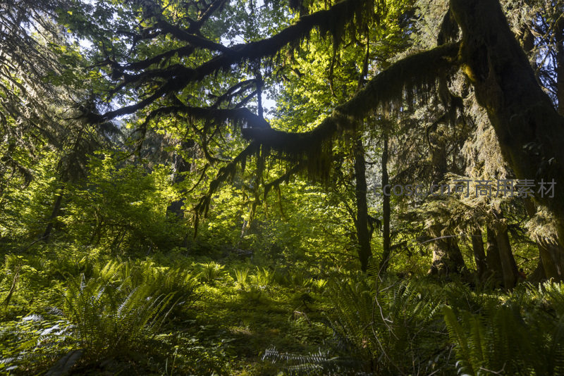 苔藓垂挂巨树枝干,阳光穿透林海洒落绿茵