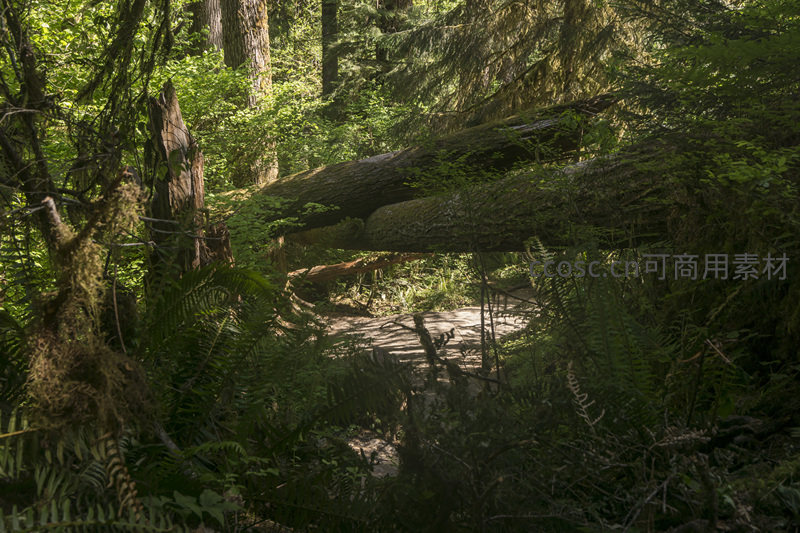 一根巨大的倒木横卧在林中小径上,周围环绕着繁茂的蕨类和苔藓,阳光透过树冠斑驳地洒下,展现原始森林的静谧与生机。