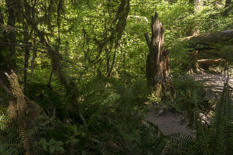 一条蜿蜒的小径穿过茂密的蕨类植物,旁边矗立着一截风化的朽木,引导观者深入这片充满野趣与神秘感的原始森林腹地。