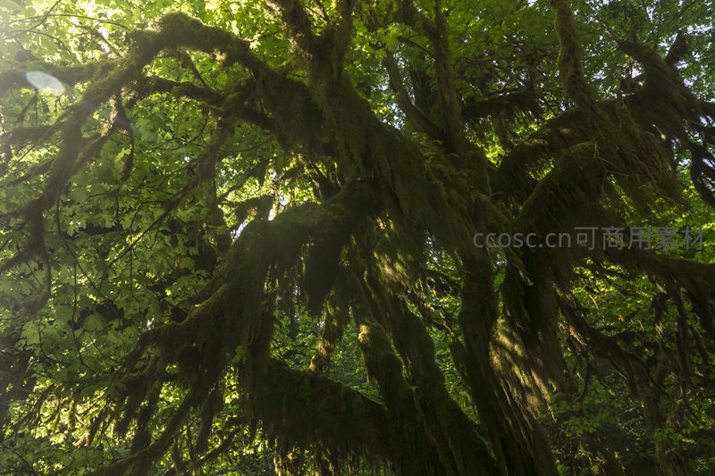 从低角度仰望,虬曲的古树枝干上覆盖厚厚苔藓,阳光穿透叶隙洒在枝桠间,尽显森林的雄浑与岁月痕迹。