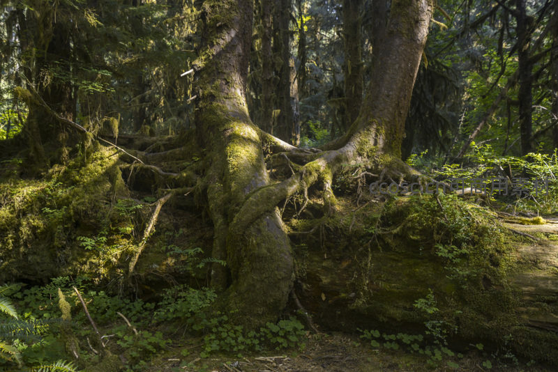 阳光穿透茂密树冠,洒在布满青苔的粗壮树根上,展现原始森林的生命力与静谧之美。
