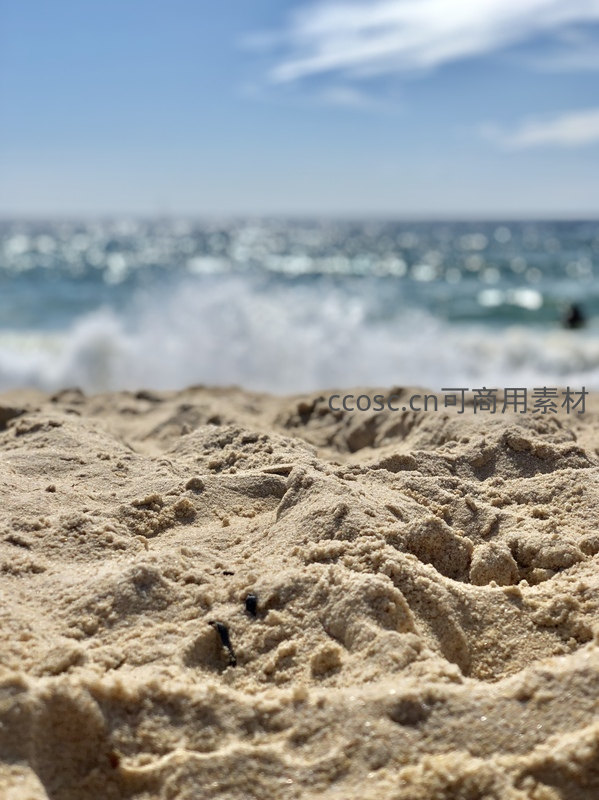 细腻的沙滩纹理在前景清晰可见,背景是模糊的蔚蓝大海和翻滚的白色浪花,营造出宁静而放松的海滨氛围。