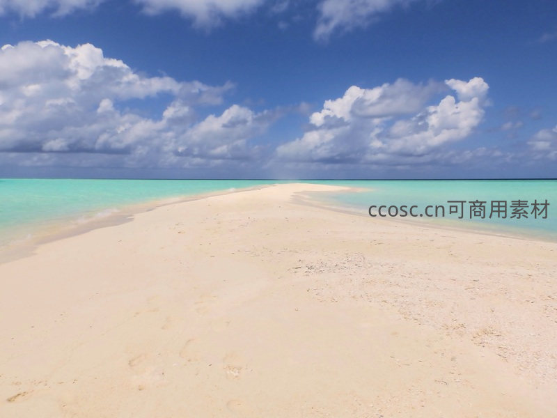 一条狭长的白色沙滩向远方延伸,两侧是如翡翠般的碧绿海水,天空中蓬松的白云与蔚蓝交相辉映,画面充满开阔与宁静之感。