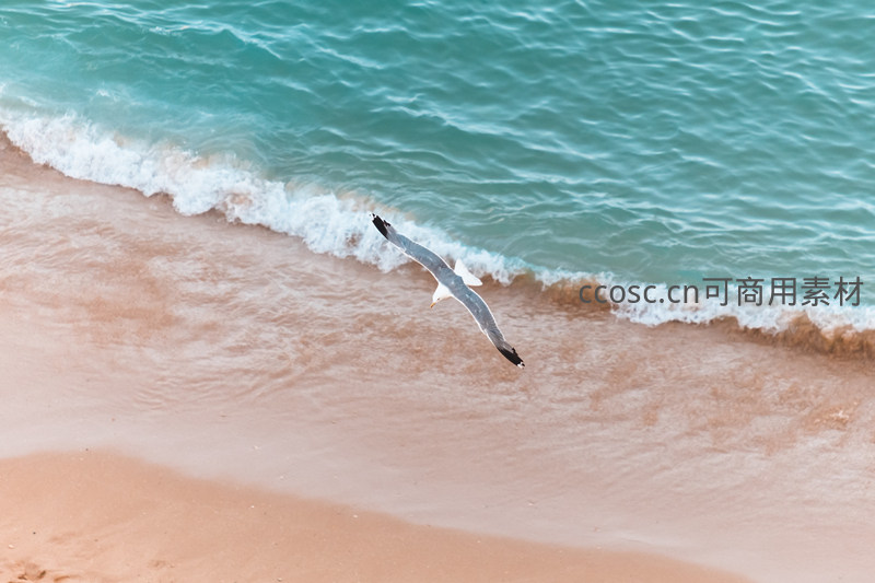 一只海鸥在蔚蓝的海面上低空飞翔,翅膀舒展,掠过金色沙滩与白色浪花,展现出自由与宁静的海滨景象。