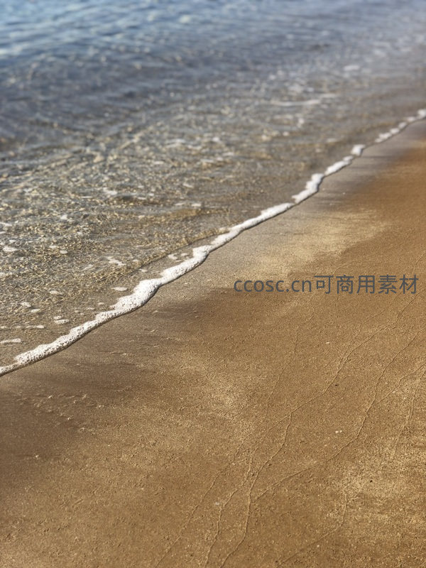 清澈海水带着细小泡沫轻轻涌上湿润沙滩,留下自然的纹理与光影,展现大海与陆地温柔相遇的瞬间。