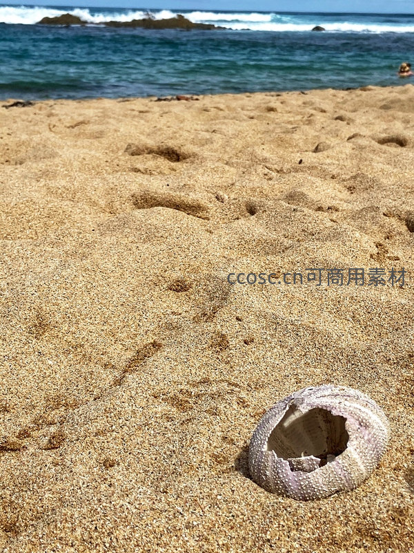 金黄细腻的沙滩上,一枚空的海胆壳静静躺在沙中,远处是翻滚的蓝色海浪和隐约可见的游人,充满宁静的海滨气息。