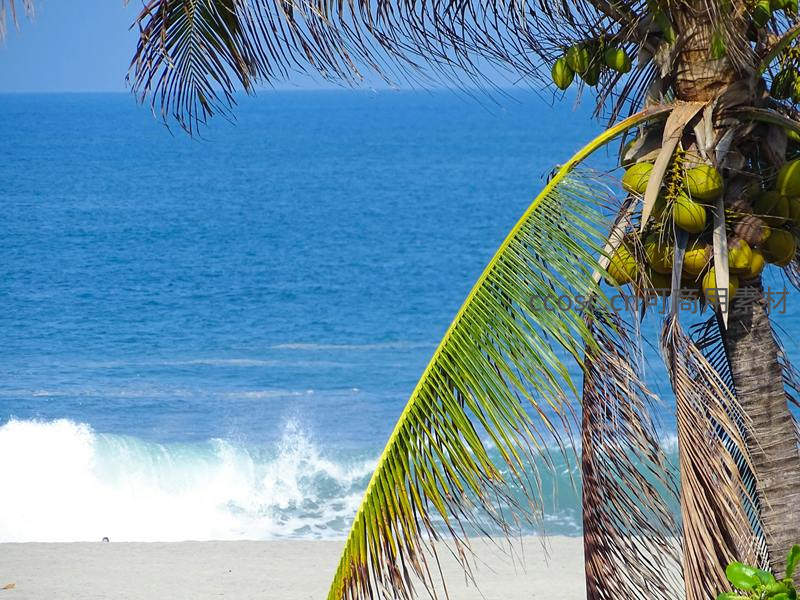前景是挂满青椰的棕榈树,背景是无垠的蔚蓝大海,浪花拍岸激起白色水沫,阳光明媚,营造出浓郁的热带海岛度假氛围。