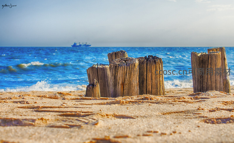 前景是几根饱经风霜的木质桩柱,背景是波光粼粼的大海和远处航行的船只,夕阳余晖洒在沙粒上,充满故事感与宁静氛围。
