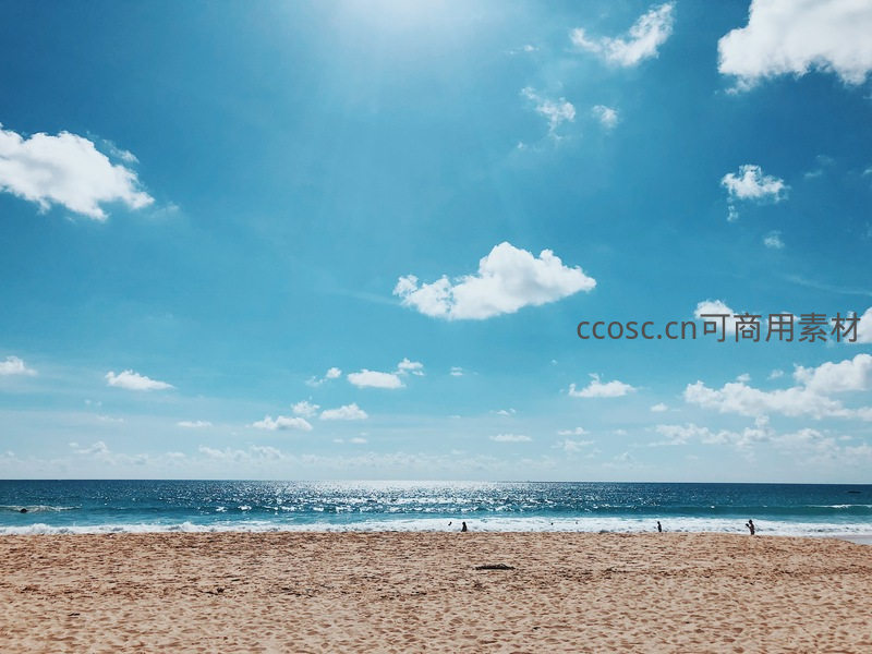明媚的阳光倾泻在广阔的金色沙滩上,远处深蓝的海面波光粼粼,几朵白云点缀着湛蓝天空,人们悠闲漫步,尽享夏日海滨时光。