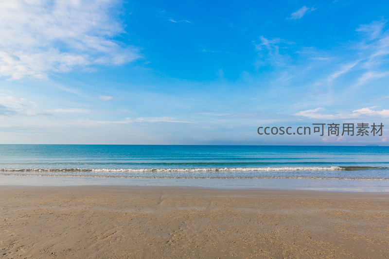 海天相接处一片宁静,浅滩上的细沙被潮水浸润,微小的波浪轻轻涌来,天空澄澈,云丝飘逸,构成一幅令人心旷神怡的自然画卷。
