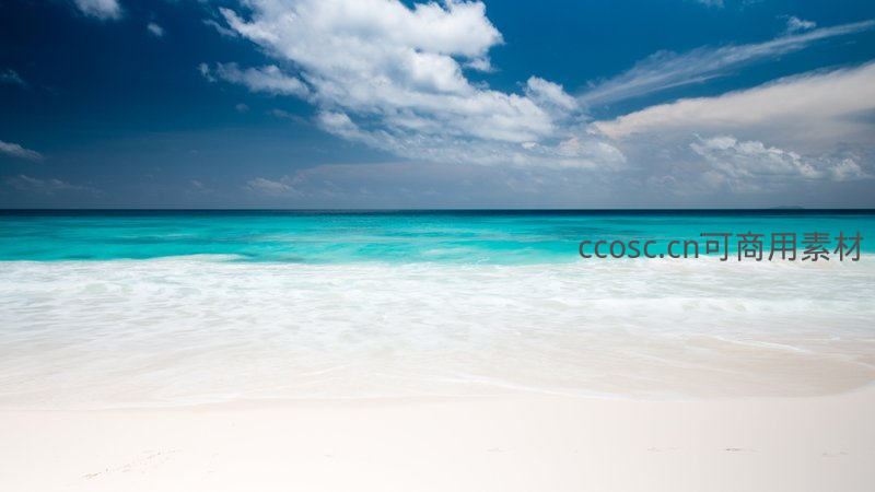清澈的碧蓝色海水与洁白细腻的沙滩相接,天空湛蓝,点缀着朵朵白云,海浪温柔地拍打着岸边,营造出宁静祥和的热带海滨氛围。