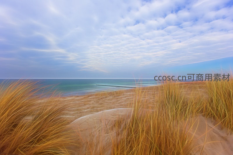 金黄色的沙丘草在微风中摇曳,前景是起伏的沙丘,远处是平静的蓝色大海,头顶是布满独特纹理云层的广阔天空,整个画面宁静而富有层次感。