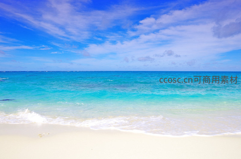 一望无际的蔚蓝大海与洁白细腻的沙滩相接,温柔的浪花轻轻拍打着海岸线,头顶是点缀着朵朵白云的晴朗天空,宛如人间天堂般的静谧美景。