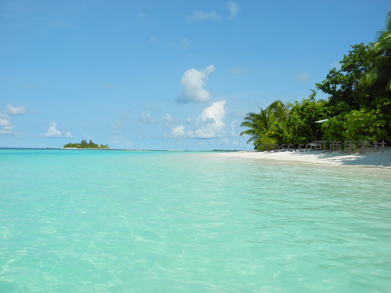 清澈见底的浅蓝色海水延伸至远方小岛,洁白沙滩旁绿意盎然的椰林摇曳生姿,营造出梦幻般的度假天堂氛围。