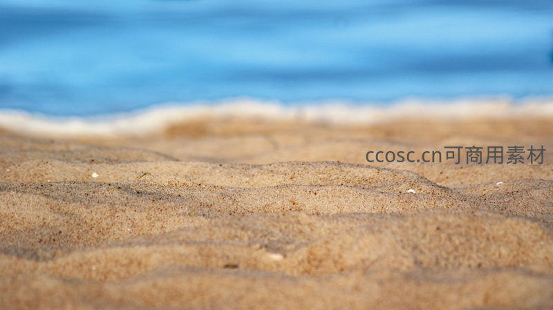 聚焦于沙滩上被潮水冲刷后留下的细腻波纹,背景是模糊的蔚蓝海水,突显自然纹理的柔和与静谧之美。