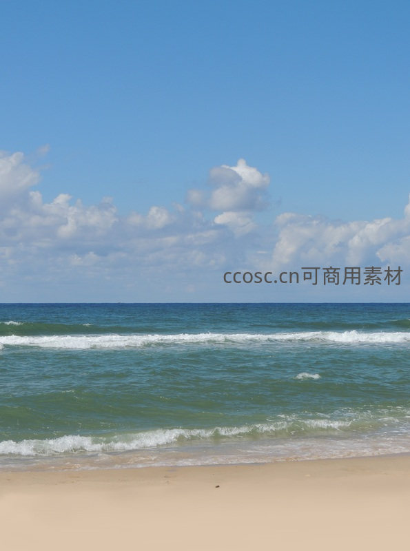 湛蓝天空点缀朵朵白云,深蓝海面泛起层层白浪,温柔地亲吻着金黄沙滩,构成一幅开阔而治愈的海滨画卷。