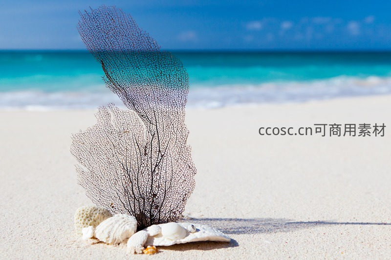 黑珊瑚与贝壳在洁白沙滩上的艺术组合