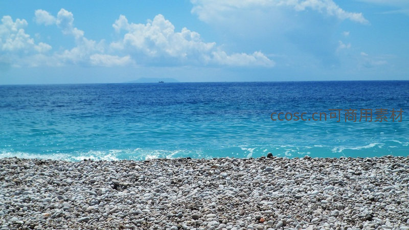 清澈碧蓝的海水与洁白云朵相映成趣,前景是铺满光滑卵石的海滩,远方岛屿若隐若现,构成一幅宁静悠远的海岛画卷。