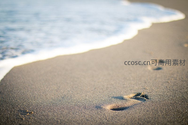 细腻的沙滩上留下一串浅浅的脚印,温柔的海浪正缓缓涌来,即将抹去这短暂的痕迹,营造出静谧而浪漫的海滨氛围。