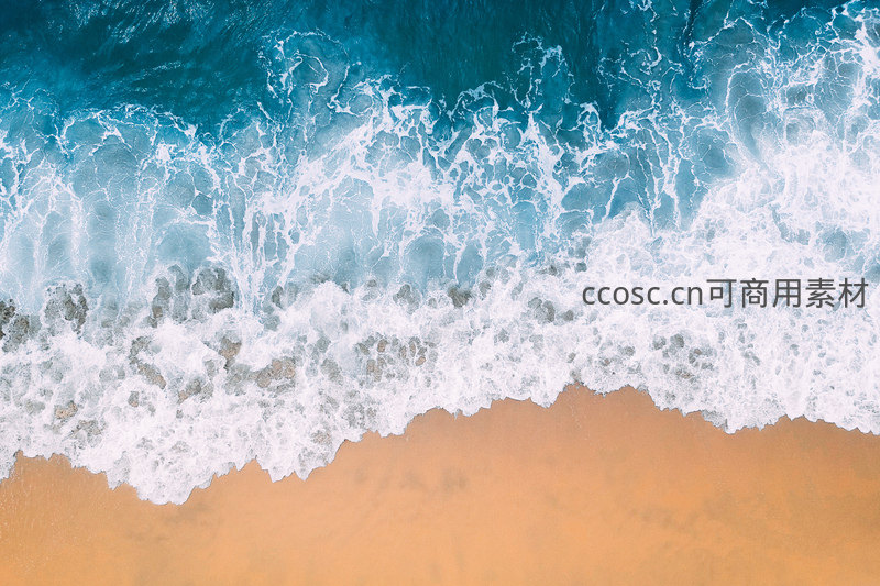 从高空俯瞰,汹涌的海浪带着洁白泡沫猛烈拍打金黄色沙滩,水与沙的边界清晰而富有韵律,展现大自然澎湃的力量与美感。