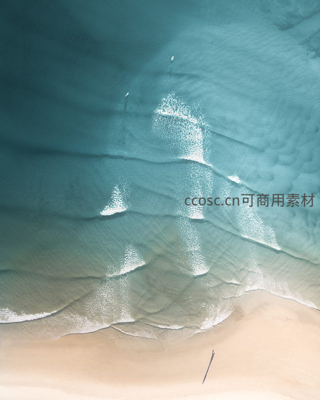 从高空俯瞰,层层叠叠的海浪如画布般铺展,一人的身影孤独地立于广袤沙滩之上,尽显大自然的壮阔与人类的渺小。