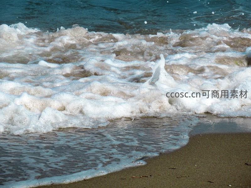 强劲的海浪卷起大量白色泡沫,猛烈冲击着深褐色的湿润沙滩,水花四溅,展现出海洋澎湃的生命力与原始力量。