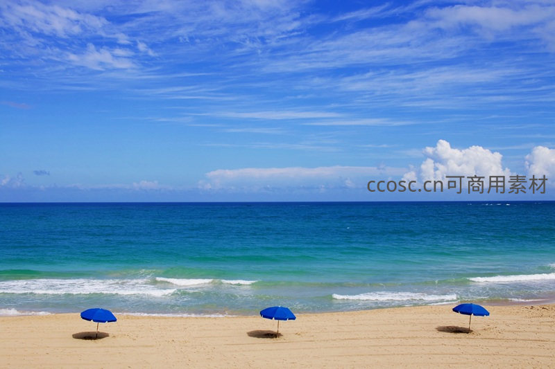 金色沙滩上三把蓝色遮阳伞静静伫立,面对着碧蓝无垠的大海与晴朗天空,营造出宁静悠闲的度假氛围。