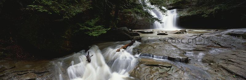 茂密森林中一道瀑布从高处倾泻而下,水流冲击岩石形成层层叠叠的白色水花,周围环境幽静而富有野趣。
