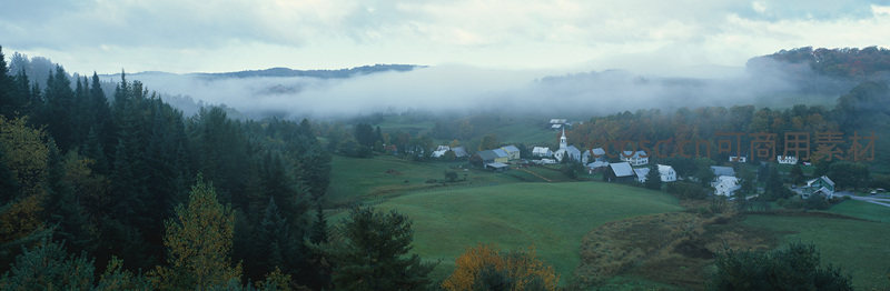 清晨薄雾弥漫在山谷与村庄之间,白墙房屋错落有致,四周环绕着色彩斑斓的秋林,营造出如诗如画的田园意境。