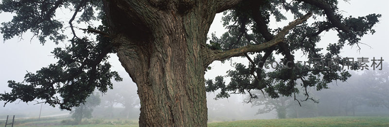 晨雾中的古老橡树全景