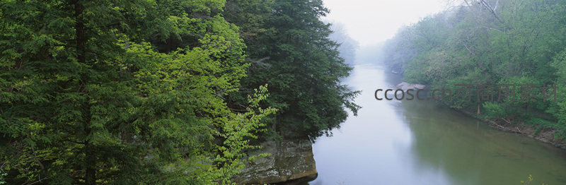 绿意盎然河谷晨雾缭绕
